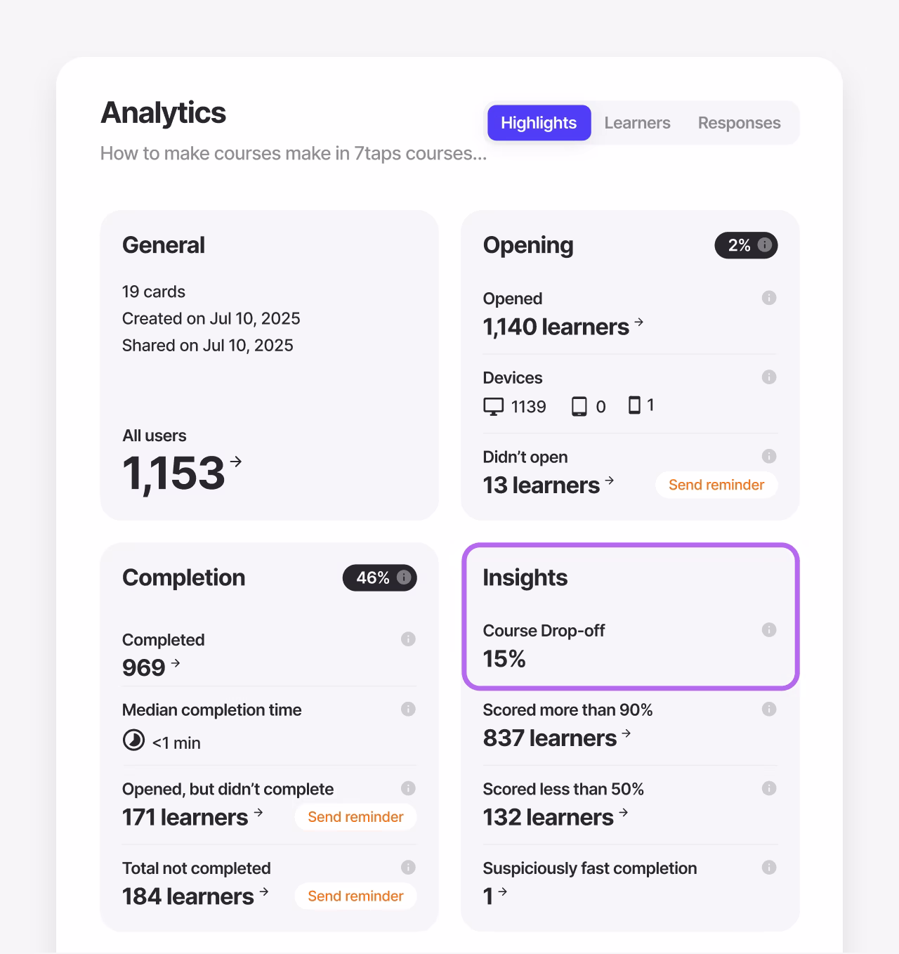 Pro tip: A drop-off rate below 30% is generally considered healthy for short-form learning. Higher numbers may indicate weak framing or low perceived relevance rather than course design issues.